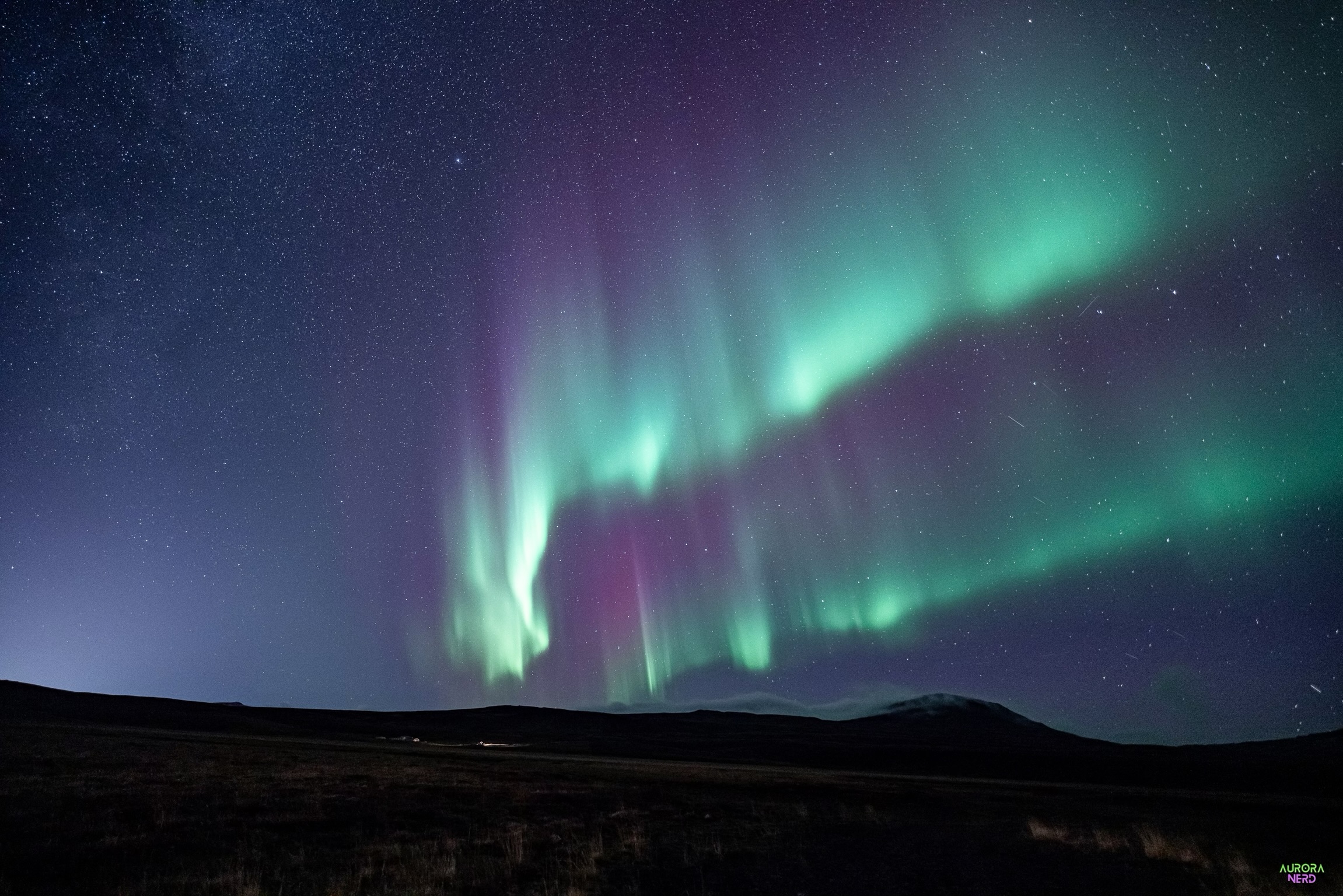 We layered up (me going four deep), hopped into a sprinter van at the pickup spot, and started hunting for the lights to the north of Reykjavik. Our tour guide was excellent; he was obviously experienced in both hunting, the telling of pre-canned (but still very funny) jokes, and general hospitality as indicated by the pastries and hot chocolate he brought along.